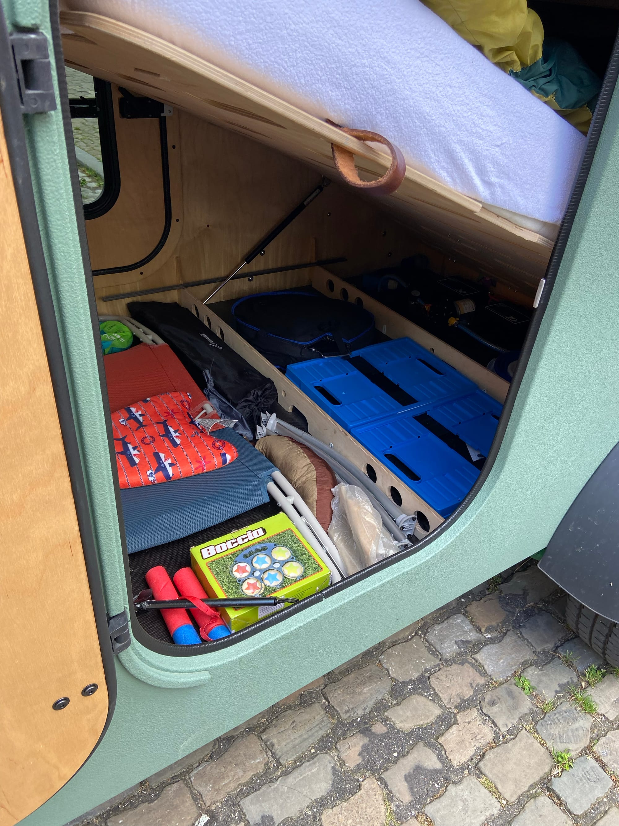 In deze teardrop minicaravan zit een uiterste comfortabel bed met volwaardige matras. Omdat we aan 2 slaapplekken niet genoeg hadden plaatsten we een daktent bovenop de teardrop. Een erg makkelijke oplossing, zeker wanneer je gaat wildkamperen.