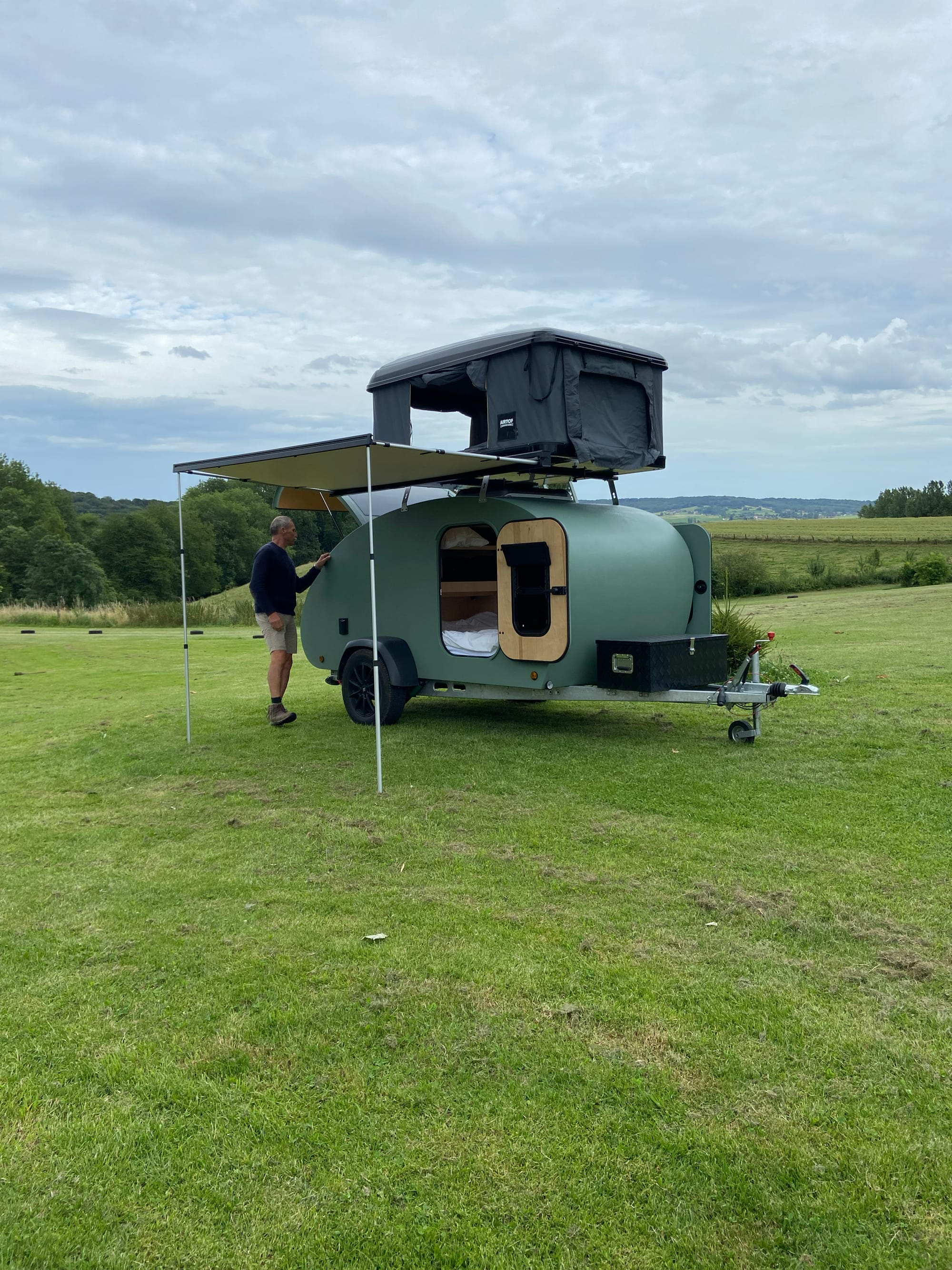 Ook al weegt deze minicaravan slechts 490 kg (leeg), wanneer je deze uitrust met een daktent, je watertank vult en je grijswatertank nog niet werd geleegd weegt deze teardrop al gauw 650 kg zonder bagage. Laad hem dus niet te vol in de configuratie met daktent want het maximale gewicht voor deze teardrop valt onder het aanhangwagen stelsel van 750 kg.