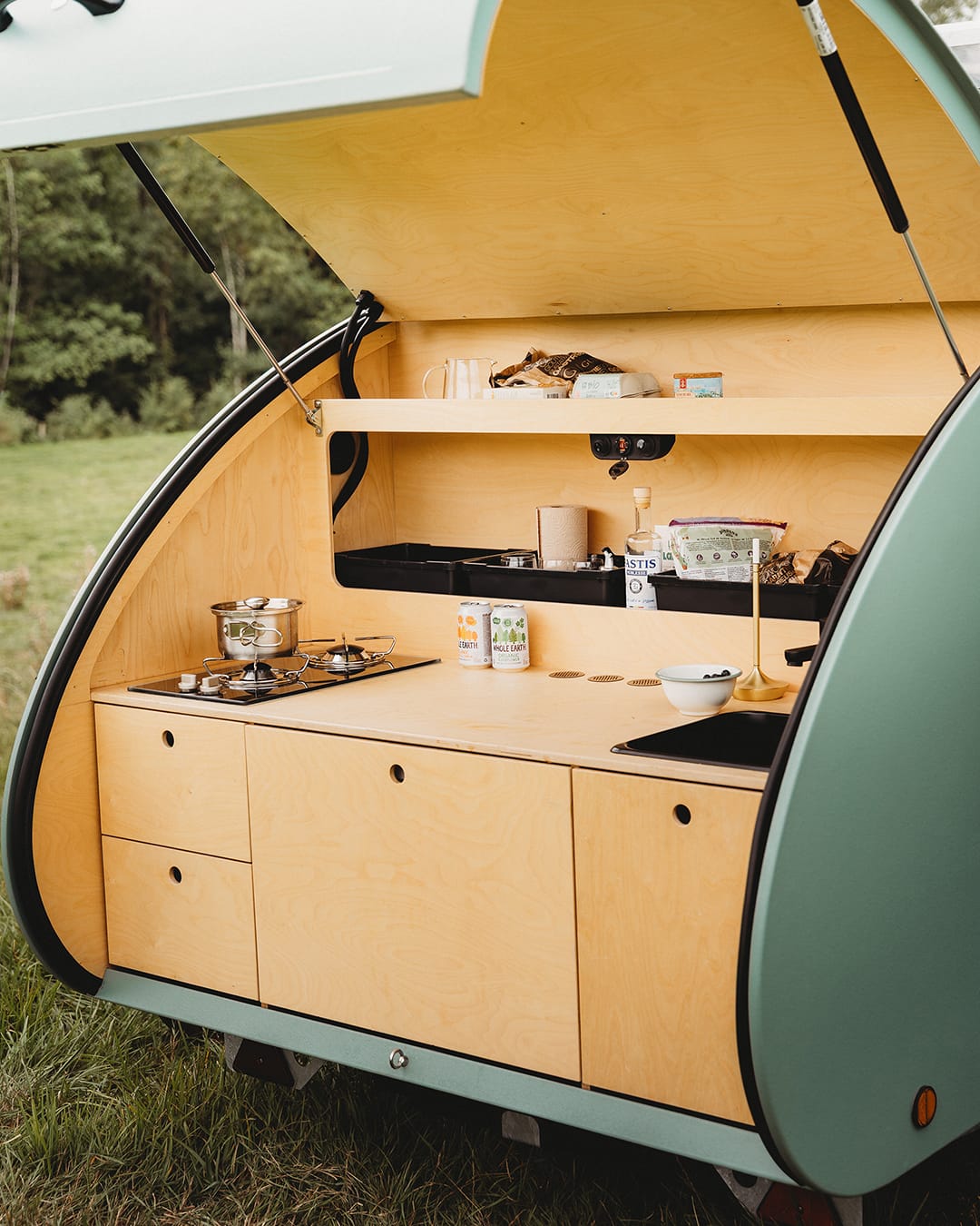 Een kwalitatieve teardrop met dubbel bed, uitgeruste keuken, koelkast, watertank, batterij en zonnepaneel, zo kan je gerust off grid kamperen.