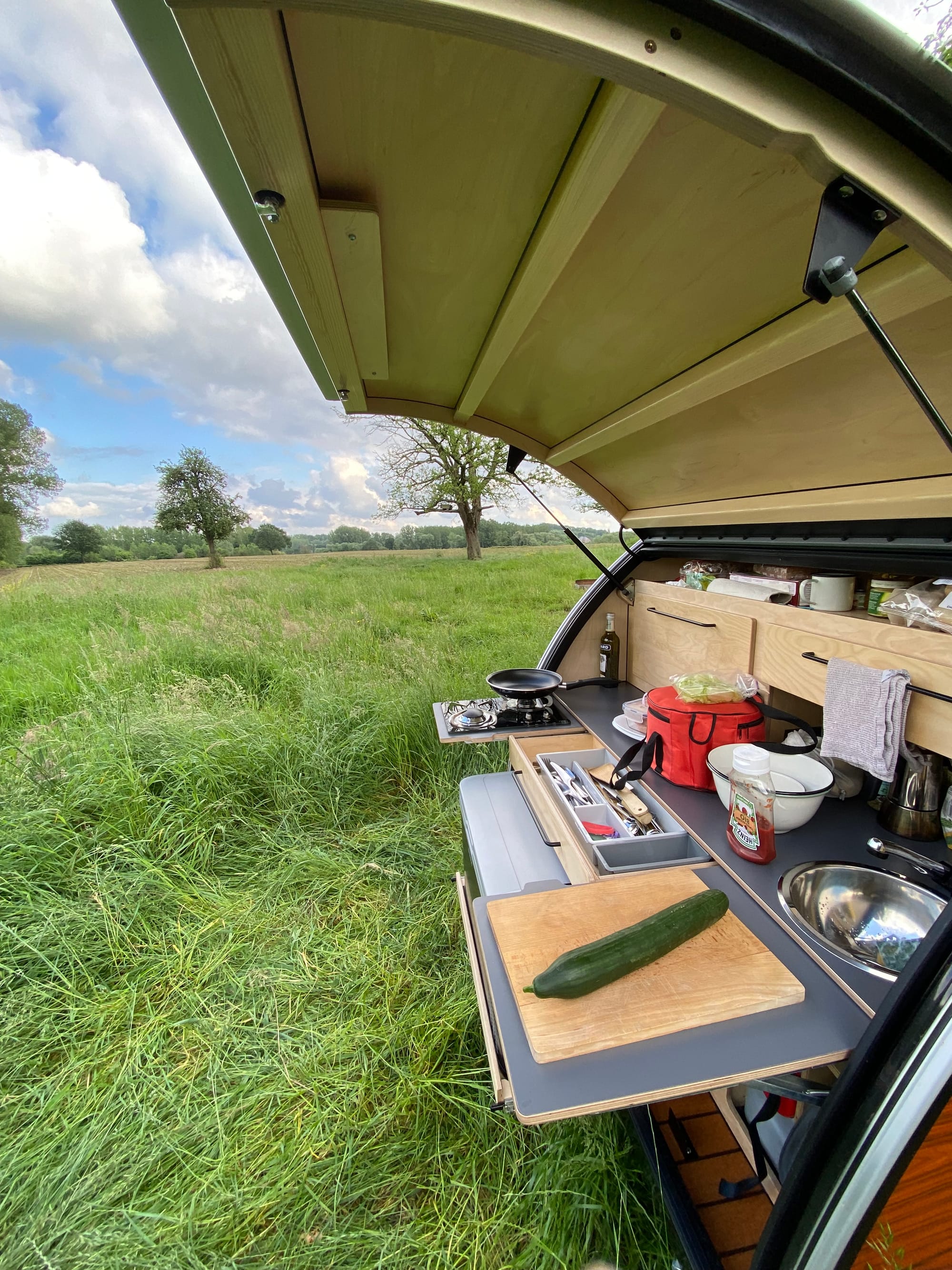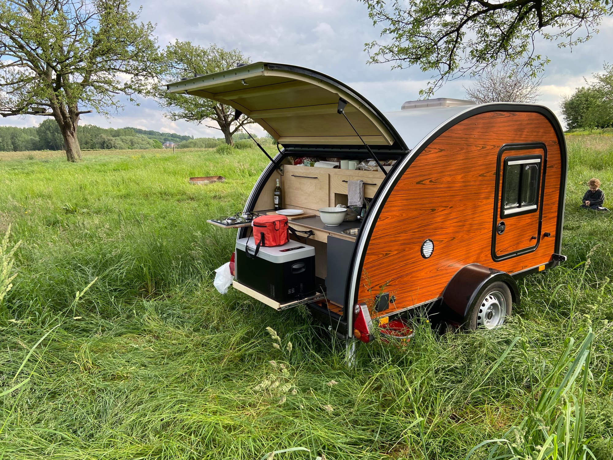Een teardrop dwingt je naar buiten, maar doe de achterklep open en je hebt steeds het comfort van een keuken bij de hand.