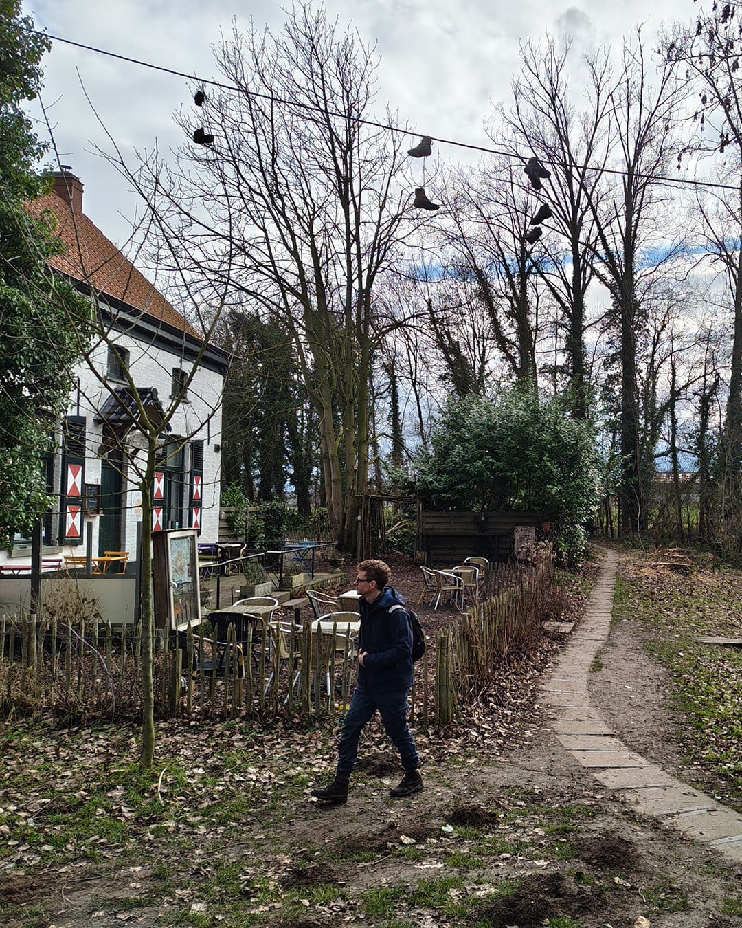 Wanneer we Gent verlaten, kleurt de hemel roze, paars en blauw. Zo’n ochtend stemt ons alvast goedgezind. In Gontrode stappen we vrijwel onmiddellijk trage wegen op: weides, bosjes, onverharde paden. Het voelt alsof we sneller dan verwacht “weg” zijn. We zullen vandaag weinig mensen zien.