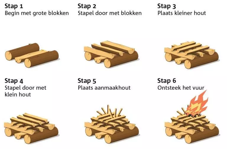 Zelf vinden we de Zwitserse methode ideaal, waarbij je start met de grootste blokken droog brandhout onderaan, en zo jenga-gewijs een raster opbouwt. Het kleinste hout en sprokkelhout plaats je bovenaan.